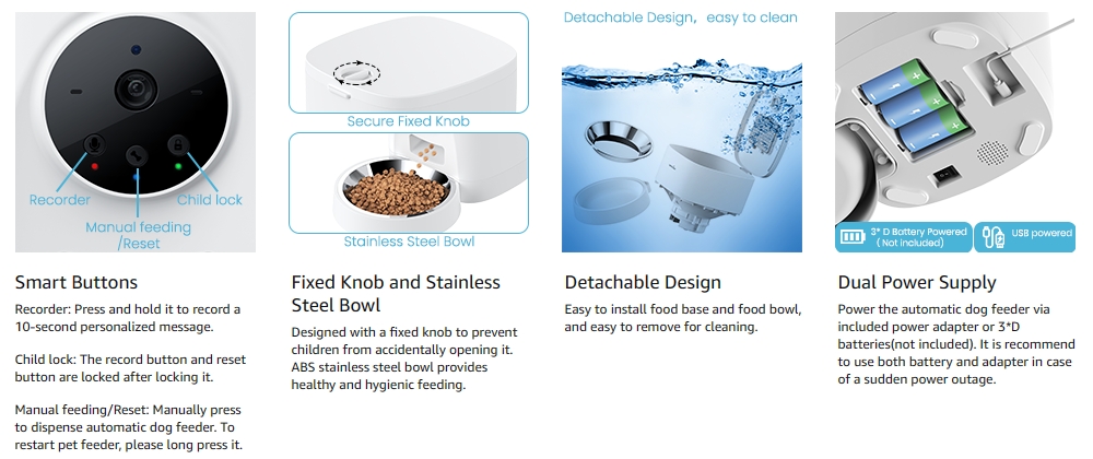 With a built-in 2K high-resolution camera and night vision support, this dog feeder can capture and record your pet's daily eating process and cute moments.